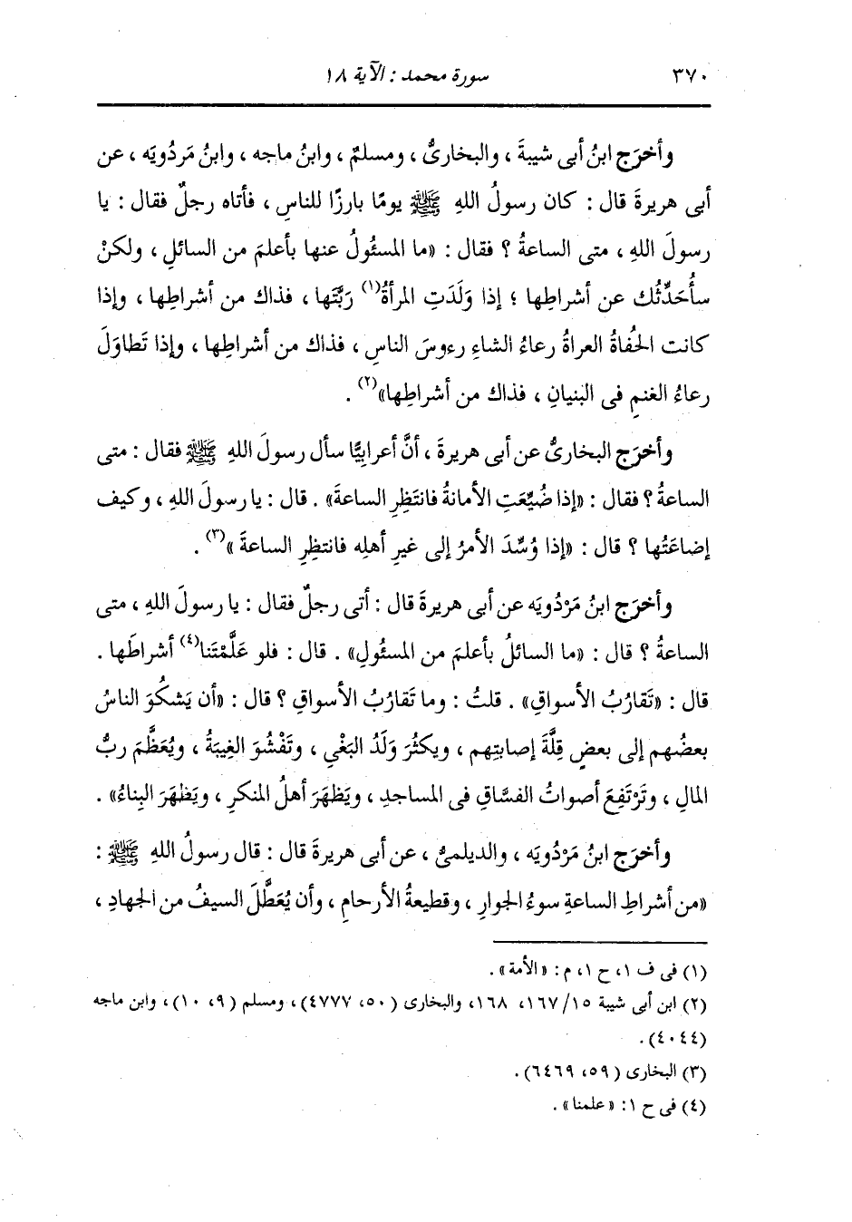 وأخرج النسائي عن عمرو بن تغلب رضي الله عنه قال : قال رسول الله صلى الله عليه وسلم : إن من أشراط الساعة أن يقبض العلم ويفشو المال وتفشو التجارة ويظهر القلم قال عمرو فإن كان هذا الرجل ليبيع البيع فيقول حتى أستأمر