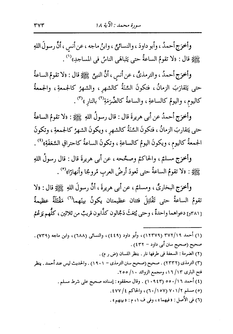 أنه رسول الله وحتى يقبض العلم وتكثر الزلازل ويتقارب الزمان وتظهر الفتن ويكثر الهرج وهو القتل وحتى يكثر فيكم المال فيفيض حتى يهم رب المال من يقبل صدقته وحتى يعرضه فيقول الذي يعرضه عليه لا أرب لي به وحتى يتطاول الناس في البنيان وحتى يمر الرجل بقبر الرجل فيقول يا ليتني مكانه وحتى تطلع الشمس من مغربها فإذا طلعت ورآها الناس آمنوا أجمعون وذلك حين لا ينفع إيمانها لم تكن آمنت من قبل أو كسبت في إيمانها خيرا ، ولتقومن الساعة وقد نشر الرجلان ثوبا بينهما فلا يتبايعانه ولا يطويانه ولتقومن الساعة وقد انصرف الرجل بلبن لقحته فلا يطعمه ولتقومن الساعة وهو يليط حوضه فلا يسقى به ولتقومن الساعة وقد رفعت أكلته إلى فيه فلا يطعمها.