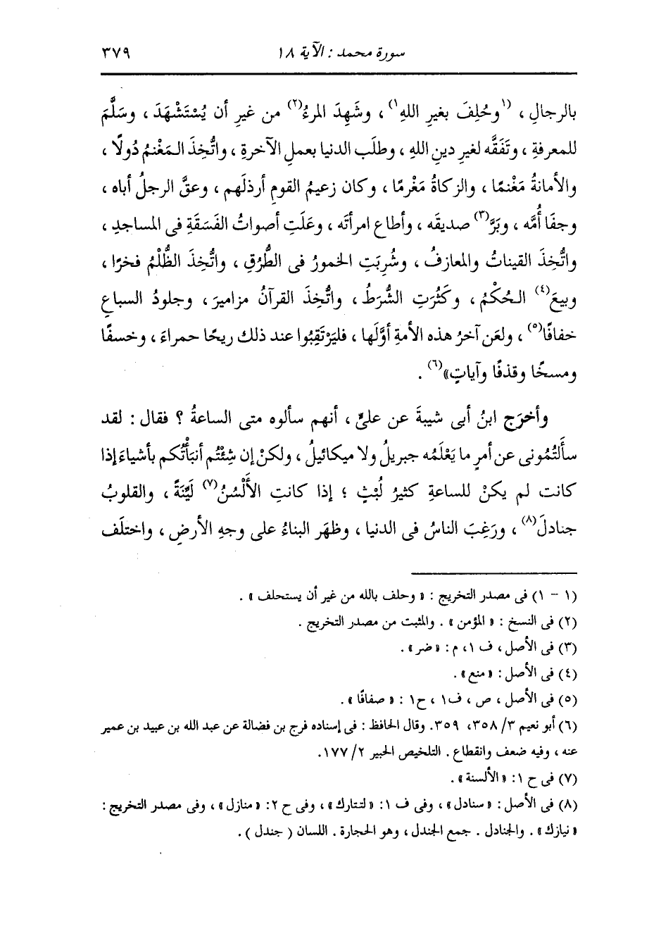 وأخرج ابن أبي شيبة عن عبد الله بن عمر بن العاص قال : إن من أشراط الساعة أن يظهر القول ويخزن العمل ويرتفع الأشرار ويوضع الأخيار ويقرأ المثاني عليهم فلا يعيها أحد منهم ، قلت : ما المثاني قال : كل كتاب سوى كتاب الله.