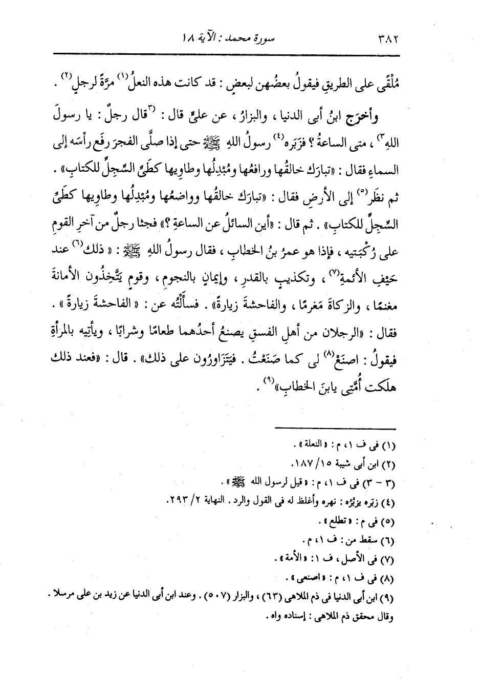 وأخرج ابن مردويه عن ابن مسعود رضي الله عنه : سمعت رسول الله صلى الله عليه وسلم يقول : لا تقوم الساعة حتى يكون السلام على المعرفة وحتى تتخذ المساجد طرقا لا يسجد لله فيها حتى يجاوز وحتى يبعث الغلام بالشيخ بريدا بين الأفقين وحتى ينطلق الفاجر إلى الأرض النامية فلا يجد فضلا.