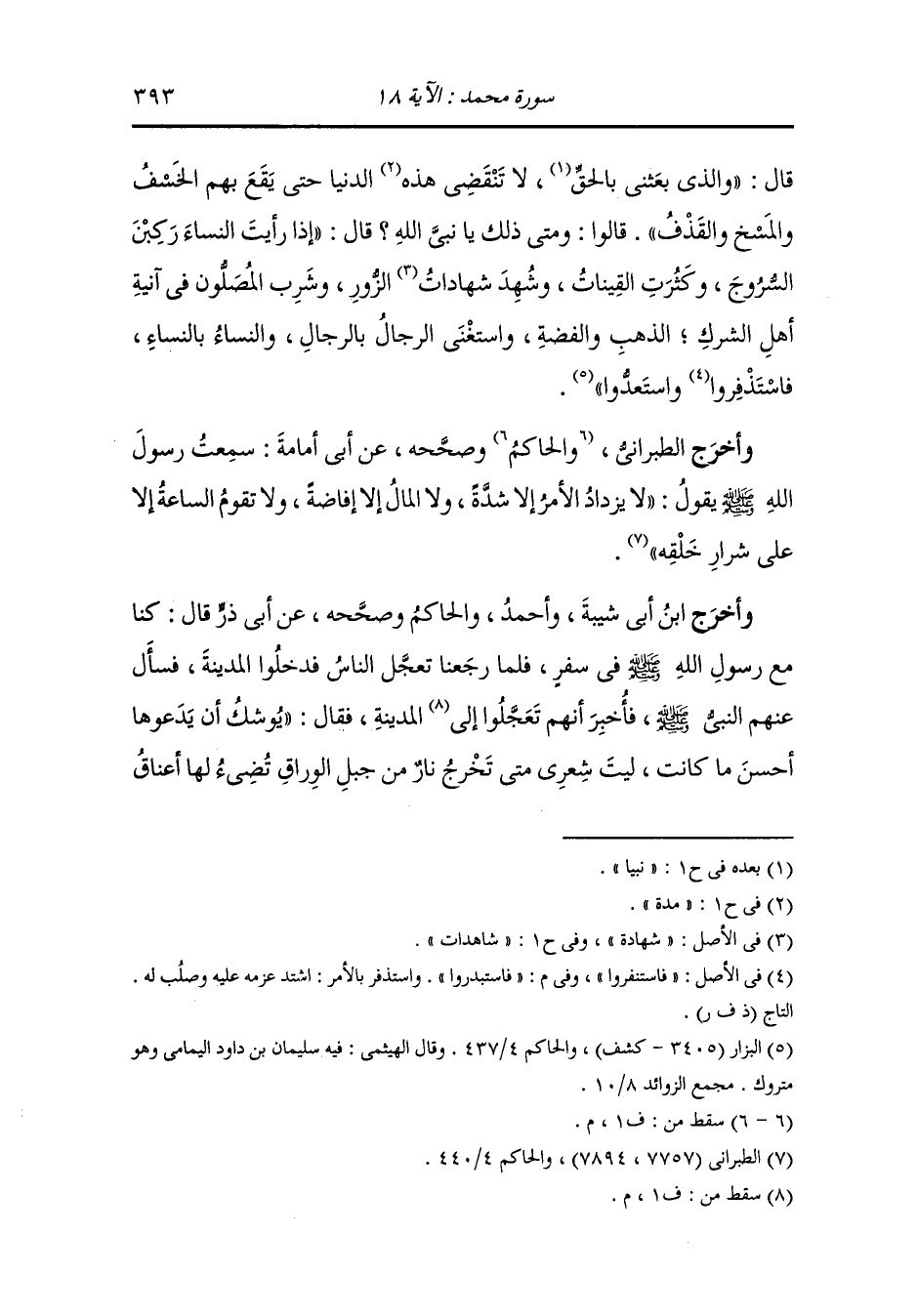وأخرج أحمد والحاكم عن رافع بن بشر السلمي عن أبيه أن رسول الله صلى الله عليه وسلم قال : تخرج نار من حبس سيل تسير بطيبة تكمن بالليل وتسير بالنهار تغدو وتروح يقال غدت النار أيها الناس فأغدوا قالت النار أيها الناس فقيلوا راحت النار فروحوا من أدركته أكلته.