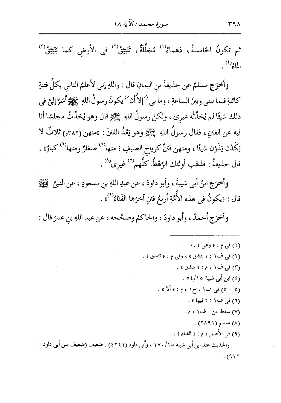 كنا قعودا عند رسول الله صلى الله عليه وسلم فذكر الفتن فأكثر في ذكرها حتى ذكر فتنة الأحلاس فقال قائل يا رسول الله : وما فتنة الأحلاس قال : هي فتنة حرب وهرب ثم فتنة السراء دخنها من تحت قدمي رجل من أهل بيتي يزعم أنه نبي وليس مني إنما أوليائي المتقون ثم يصطلح الناس على رجل كورك على ضلع ثم فتنة الدهيماء لا تدع أحدا من هذه الأمة إلا لطمته حتى إذا قيل انقضت عادت يصبح الرجل فيها مؤمنا ويمسي كافرا حتى يصير الناس إلى فسطاطين فسطاط إيمان لا نفاق فيه وفسطاط نفاق لا إيمان فيه فإذا كان ذاكم فأنظروا الدجال من يومه أو من غده.