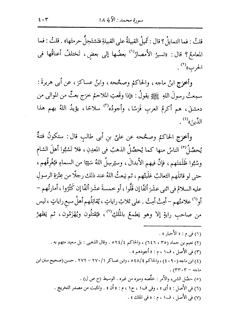 وأخرج أحمد عن أبي سعيد الخدري رضي الله عنه قال : قال رسول الله صلى الله عليه وسلم : أبشركم بالمهدي يبعثه الله في أمتي على اختلاف من الزمان وزلازل فيملأ الأرض قسطا وعدلا كما ملئت جورا وظلما ويرضى عنه ساكنو السماء وساكنو الأرض يقسم الأرض ضحاحا ، فقال له رجل : ما ضحاحا قال : بالسوية بين الناس ويملأ قلوب أمة محمد غنى ويسعهم عدله حتى يأمر مناد ينادي يقول : من كانت له في مال حاجة فما يقوم من المسلمين إلا رجل