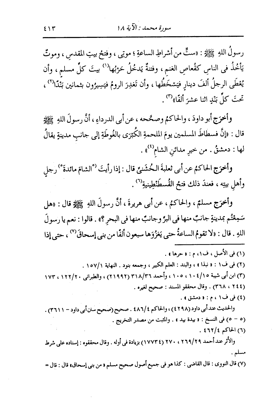 جاؤوها نزلوا فلم يقاتلوا بسلاح ولم يرموا بسهم فيقولون لا إله إلا الله والله أكبر فيسقط أحد جانبيها ثم يقولون الثانية لا إله إلا الله والله أكبر فيسقط جانبها الآخر ثم يقولون الثالثة لا إله إلا الله والله أكبر فيفرج لهم فيدخلونها فيغنمون فبينما هم يقتسمون الغنائم إذ جاءهم الصريخ أن الدجال قد خرج فيتركون كل شيء ويرجعون ، قال الحاكم : يقال إن هذه المدينة هي القسطنطينية صح أن فتحها مع قيام الساعة.
