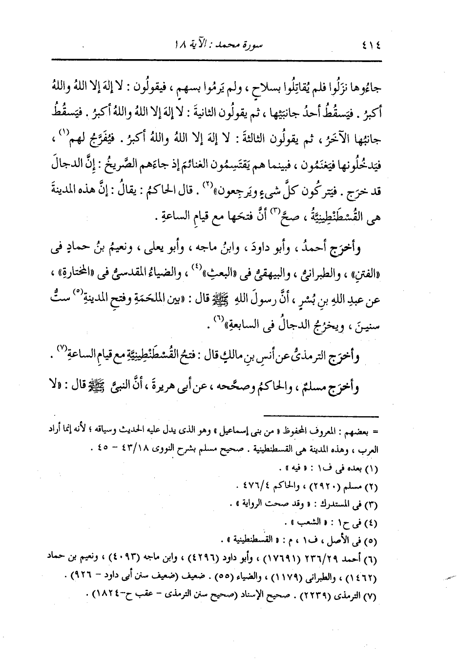 ويقتل ثلثهم أفضل الشهداء عند الله ويصبح ثلث لا يفتنون أبدا فيبلغون القسطنطينية فيفتتحون فبينما هم يقتسمون غنائمهم وقد علقوا سلاحهم بالزيتون إذ صاح الشيطان ، أن المسيح قد خلفكم في أهليكم وذاك باطل فإذا جاؤوا الشام خرج فبينما هم يعدون للقتال ويسوون الصفوف إذ أقيمت الصلاة صلاة الصبح فينزل عيسى بن مريم فأمهم فإذا رآه عدو الله ذاب كما يذوب الملح فلو تركه لذاب حتى يهلك ولكن الله يقتله بيده فيريهم دمه في حربته.
