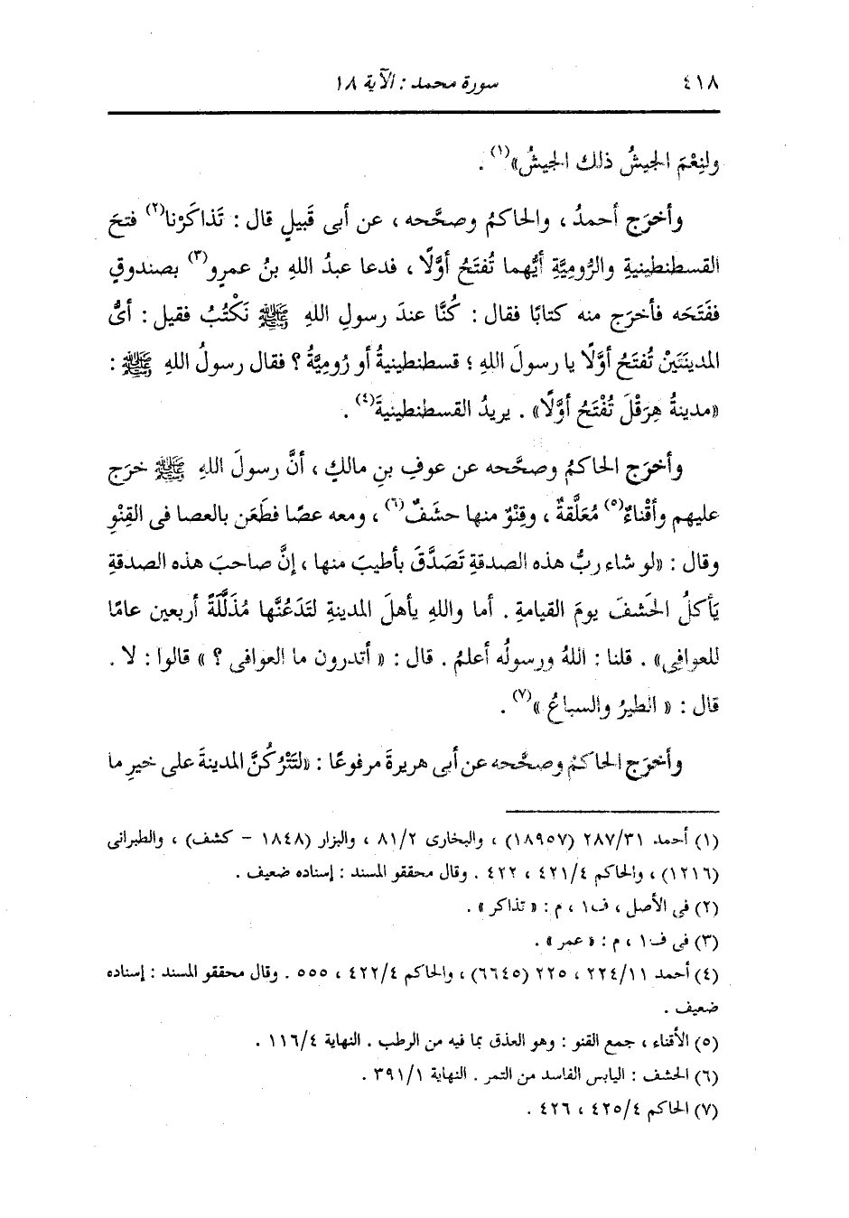 وأخرج الحاكم وصححه عن محجن بن الأدرع أن رسول الله صلى الله عليه وسلم صعد أحدا وصعدت معه فأقبل بوجهه نحو المدينة فقال لها قولا ثم قال : ويل أمك أو يح أمها قرية يدعها أهلها أينع ما تكون يأكلها عافية الطير والسباع ولا يدخلها الدجال إن شاء الله كلما أراد دخولها يلقاه : بكل نقب من أنقابها ملك مصلت يمنعه عنها.