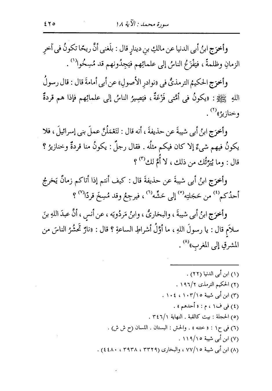 وأخرج ابن أبي شيبة وأحمد والترمذي وقال : حسن صحيح عن عبد الله بن عمرو قال : قال رسول الله صلى الله عليه وسلم : ستخرج نار قبل يوم القيامة من بحر حضرموت تحشر الناس قالوا يا رسول الله : فما تأمرنا قال : عليكم بالشام.