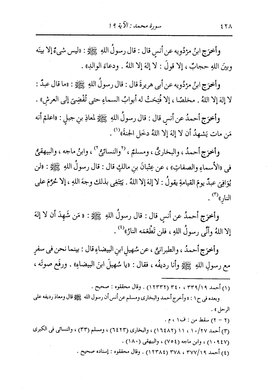 وأخرج أحمد ومسلم والنسائي ، وَابن حبان والبيهقي عن عثمان قال : قال رسول الله صلى الله عليه وسلم : من مات وهو يعلم أن لا إله إلا الله دخل الجنة.