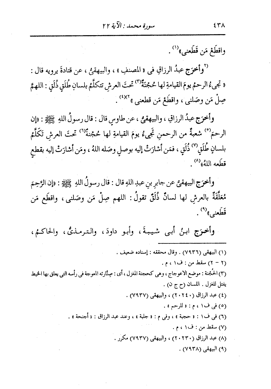 وصححاه والبيهقي عن عبد الرحمن بن عوف رضي الله عنه أنه سمع رسول الله صلى الله عليه وسلم يقول : قال الله أنا الرحمن خلقت الرحم وشققت لها إسما من اسمي فمن وصلها وصلته ومن قطعها قطعته ومن بتها بتته.