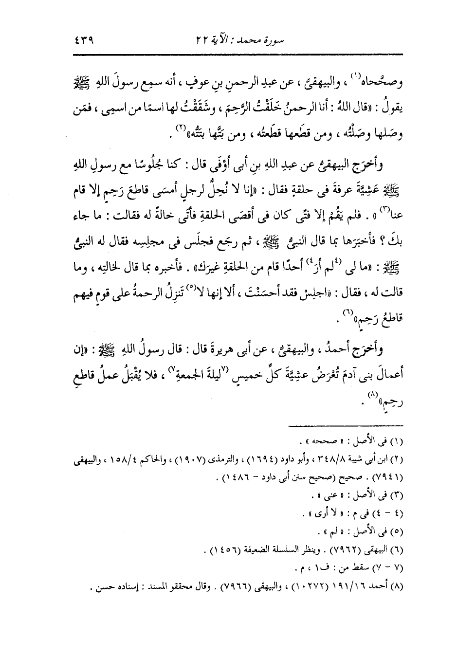 وأخرج الحاكم وصححه عن سعيد بن زيد رضي الله عنه قال : قال رسول الله صلى الله عليه وسلم : الرحم شجنة من الرحمن فمن وصلها وصله الله ومن قطعها قطعه الله.