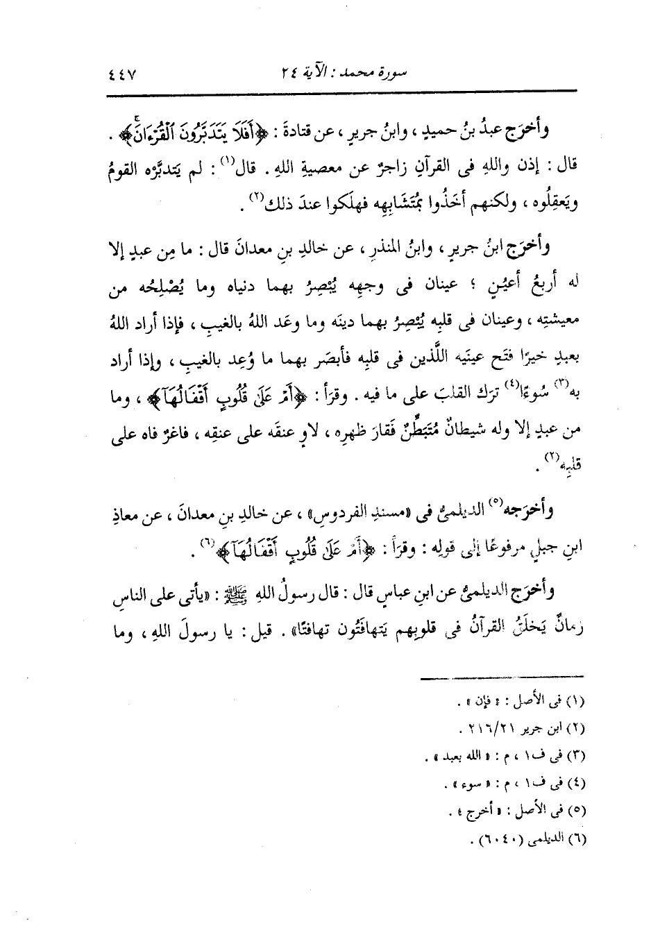 تهافتهم قال : يقرأ أحدهم فلا يجد حلاوة ولا لذة يبدأ أحدهم بالسورة وإنما معه آخرها فإن عملوا قالوا ربنا اغفر لنا وإن تركوا الفرائض قالوا : لا يعذبنا الله ونحن لا نشرك به شيئا أمرهم رجاء ولا خوف فيهم {أولئك الذين لعنهم الله فأصمهم وأعمى أبصارهم أفلا يتدبرون القرآن أم على قلوب أقفالها}.