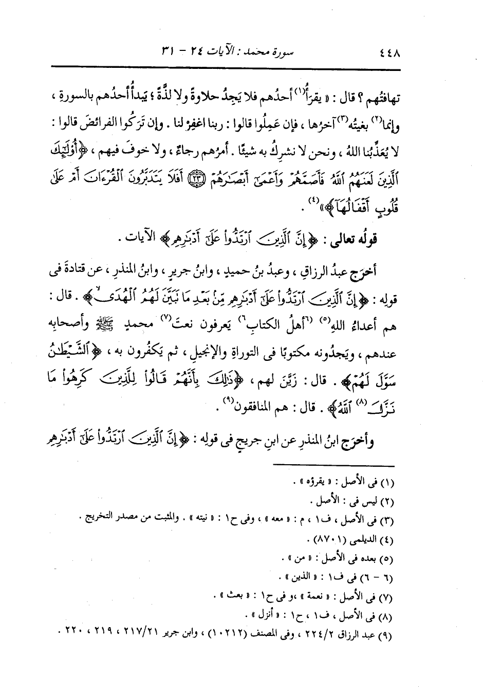 وأخرج ابن جرير عن ابن عباس رضي الله عنهما {إن الذين ارتدوا على أدبارهم} ، إلى {إسرارهم} هم أهل النفاق.