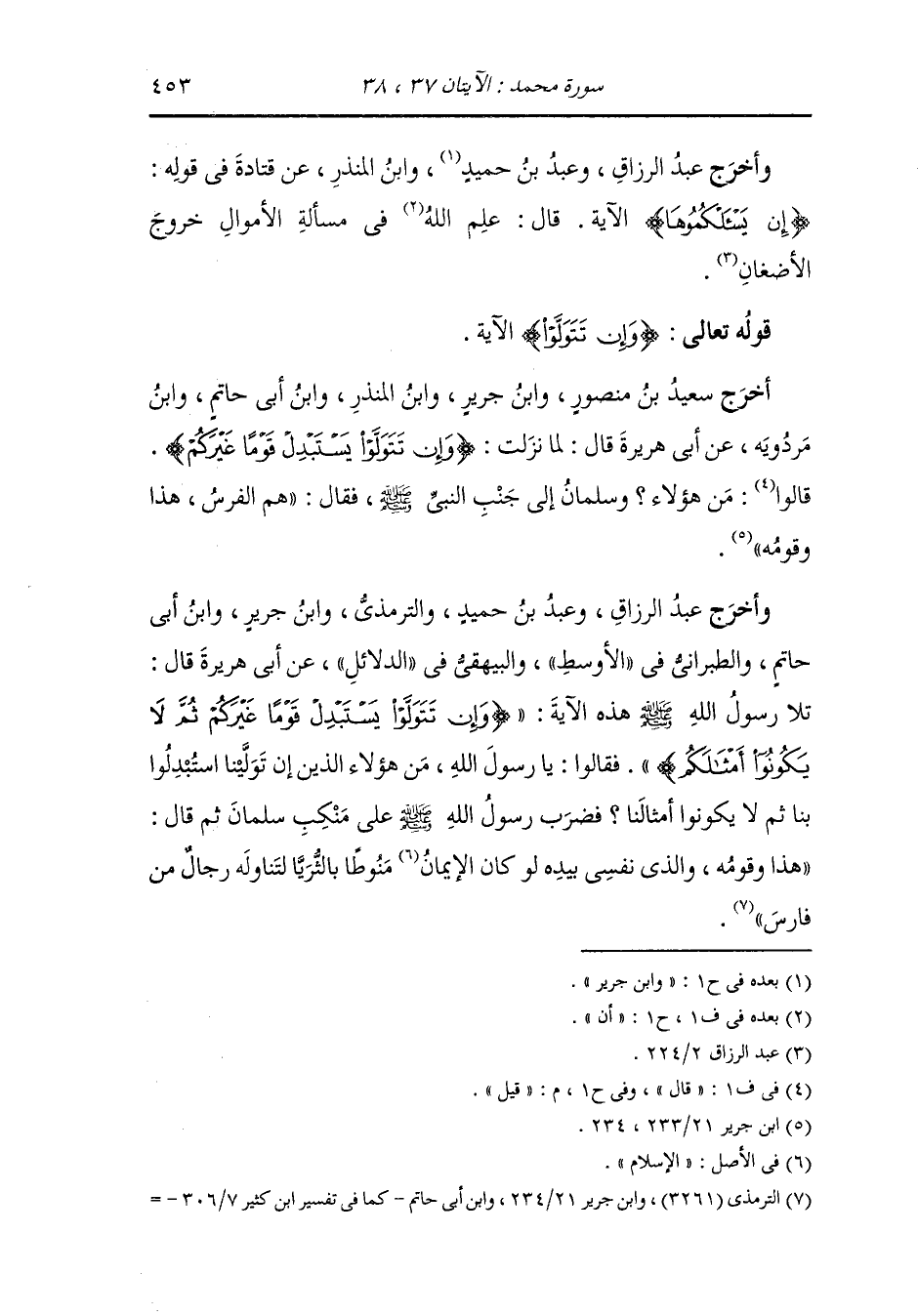 وأخرج ابن مردويه ، عَن جَابر رضي الله عنه أن النَّبِيّ صلى الله عليه وسلم تلا هذه الآية {وإن تتولوا يستبدل قوما غيركم} الآية فسئل من هم قال : فارس لو كان الدين بالثريا لتناوله رجال من فارس.