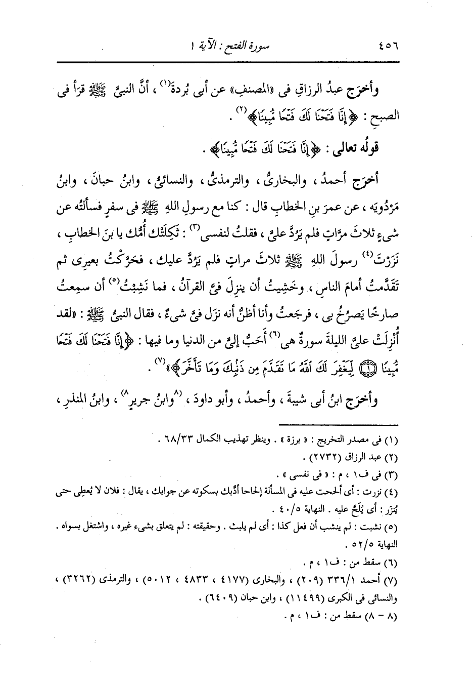 وأخرج ابن أبي شيبة وأحمد والبخاري في تاريخه وأبو داود والنسائي ، وَابن جَرِير والطبراني ، وَابن مردويه والبيهقي في الدلائل عن ابن مسعود رضي الله عنه قال : أقبلنا من الحديبية مع رسول الله صلى الله عليه وسلم فبينا نحن نسير إذ أتاه الوحي وكان إذا أتاه إشتد عليه فسري عنه وبه من السرور ما شاء الله