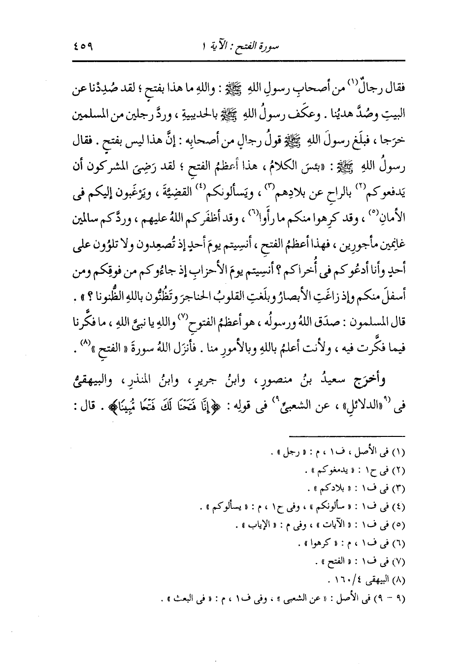 وأخرج البيهقي عن المسور ومروان في قصة الحديبية قالا : ثم انصرف رسول الله صلى الله عليه وسلم راجعا فلما كان بين مكة والمدينة نزلت سورة الفتح من أولها إلى آخرها فلما أمن الناس وتفاوضوا لم يكلم أحدا بالإسلام إلا دخل فيه فلقد دخل في تلك السنين في الإسلام أكثر مما كان فيه قبل ذلك فكان صلح الحديبية فتحا عظيما.