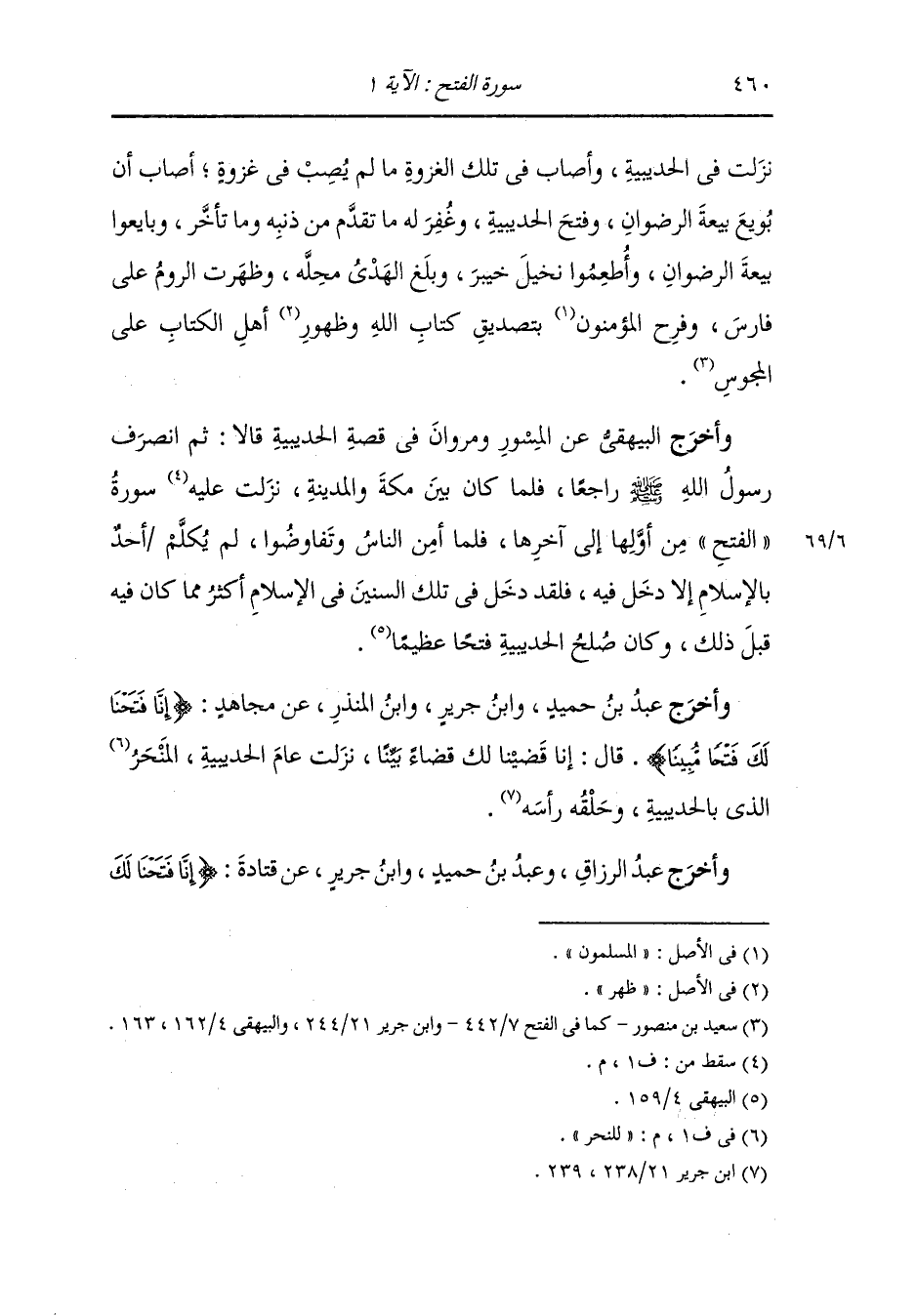 وأخرج عَبد بن حُمَيد عن عامر الشعبي رضي الله عنه أن رجلا سأل النَّبِيّ صلى الله عليه وسلم يوم الحديبية : أفتح هذا قال : وأنزلت عليه {إنا فتحنا لك فتحا مبينا} فقال النَّبِيّ صلى الله عليه وسلم : نعم عظيم قال : وكان فصل ما بين الهجرتين فتح الحديبية قال : (لا يستوي منكم من أنفق من قبل الفتح وقاتل) (الحديد 10) الآية.