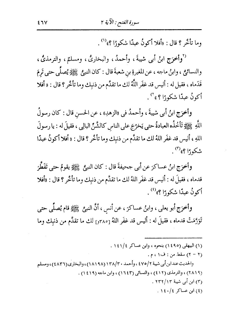 وأخرج الحسن بن سفيان ، وَابن عساكر عن عائشة رضي الله عنها قالت : كان النَّبِيّ صلى الله عليه وسلم يصلي حتى ترم قدماه قلت يا رسول الله : أتفعل هذا وقد غفر الله لك ما تقدم من ذنبك وما تأخر قال : أفلا أكون عبادا شكورا.