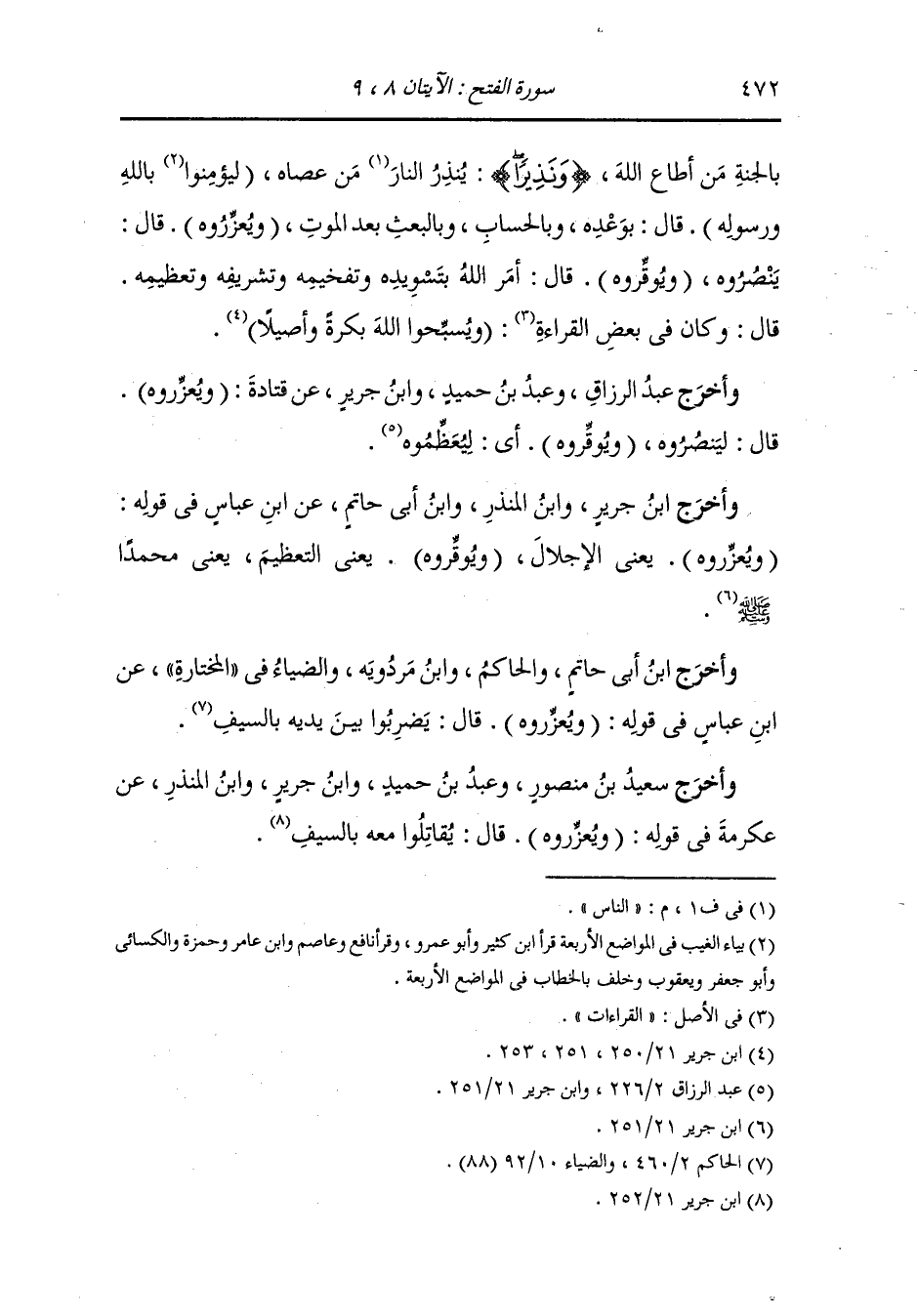 وأخرج ابن مردويه عن عكرمة رضي الله عنه قال : كان ابن عباس يقرأ هذه الآية {لتؤمنوا بالله ورسوله وتعزروه وتوقروه وتسبحوه بكرة وأصيلا} قال : فكان يقول : إذا أشكل ياء أو تاء فأجعلوها على ياء فإن القرآن كله على ياء.