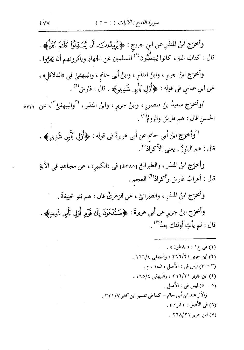 وأخرج سعيد بن منصور ، وَابن جَرِير ، وَابن المنذر والبيهقي عن عكرمة وسعيد بن جبير رضي الله عنه في قوله {ستدعون إلى قوم أولي بأس شديد} قال : هوازن يوم حنين.