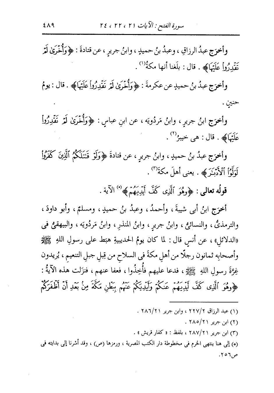وأخرج عَبد بن حُمَيد ، وَابن جَرِير عن قتادة {وهو الذي كف أيديهم عنكم وأيديكم عنهم ببطن مكة} قال : بطن مكة الحديبية ذكر لنا أن رجلا من أصحاب رسول الله صلى الله عليه وسلم يقال له زنيم أطلع الثنية زمان الحديبية فرماه المشركون فقتلوه فبعث رسول الله صلى الله عليه وسلم خيلا فأتوا بأثني عشر فارسا فقال لهم رسول الله صلى الله عليه وسلم : هل لكم عهد أو ذمة قالوا لا ، فأرسلهم فأنزل الله في ذلك {وهو الذي كف أيديهم عنكم} الآية.