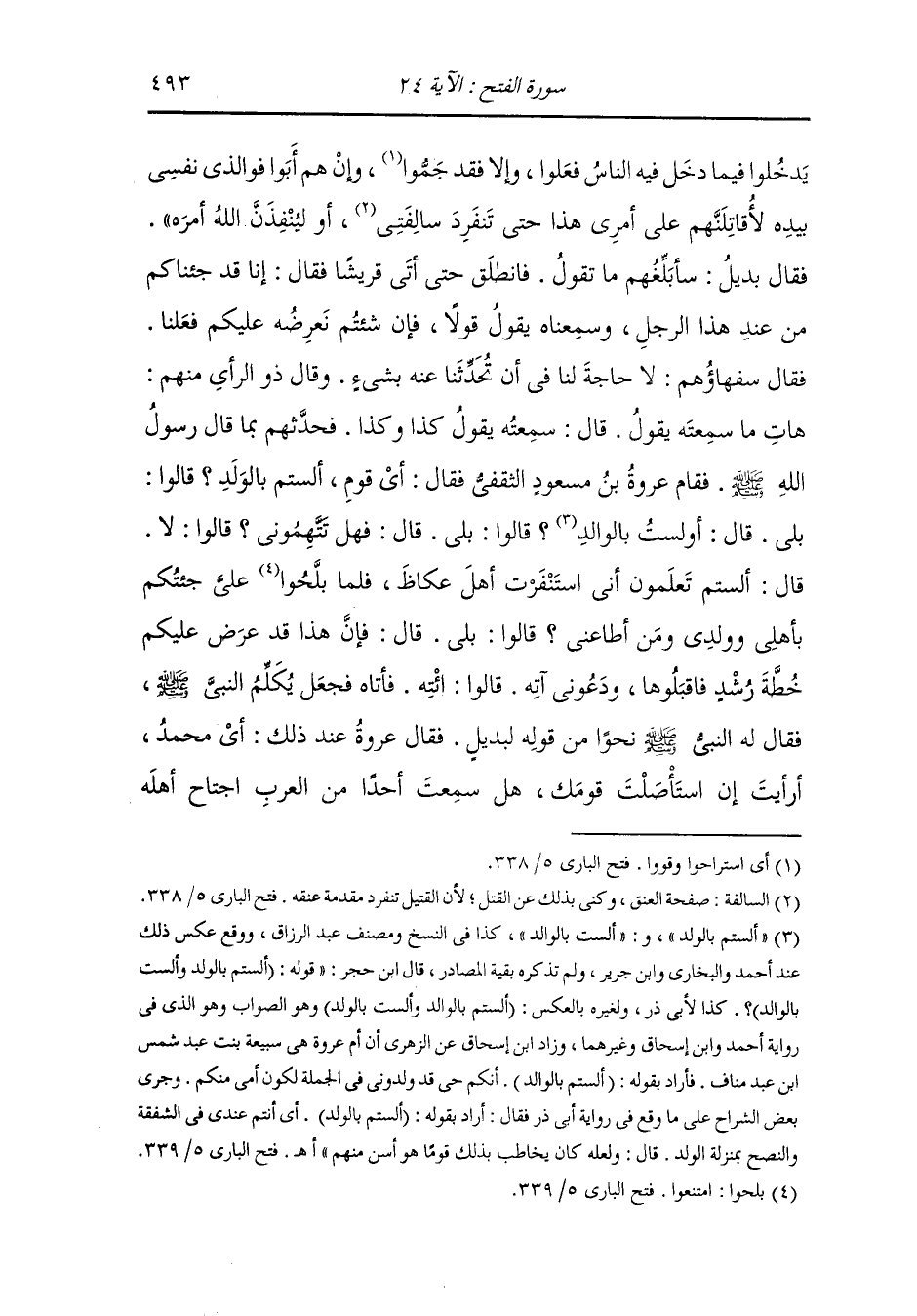 قبلك وإن تكن الأخرى فوالله إني لأرى وجوها وأرى أوباشا من الناس خليقا أن يفروا ويدعوك ، فقال له أبو بكر : أمصص بظر اللات أنحن نفر عنه وندعه فقال : من ذا قال : أبو بكر ، قال : أما والذي نفسي بيده لولا يد كانت لك عندي لم أجزك بها لأجبتك ، قال : وجعل يكلم النَّبِيّ صلى الله عليه وسلم فكلما كلمه أخذ بلحيته والمغيرة بن شعبة قائم على رأس النَّبِيّ صلى الله عليه وسلم ومعه السيف وعليه المغفر فكلما أهوى عروة بيده إلى لحية النَّبِيّ صلى الله عليه وسلم ضرب المغيرة يده بنعل السيف وقال : أخر يدك عن لحية رسول الله صلى الله عليه وسلم ، فرفع عروة رأسه فقال : من هذا قالوا : المغيرة بن شعبة ، قال : أي غدر ألست أسعى في غدرتك وكان المغيرة صحب قوما في الجاهلية فقتلهم وأخذ أموالهم ثم جاء فأسلم فقال النَّبِيّ صلى الله عليه وسلم : أما الإسلام فأقبل وأما المال فلست منه في شيء ، ثم إن عروة جعل يرمق أصحاب النَّبِيّ صلى الله عليه وسلم بعينيه ، قال : فوالله ما تنخم رسول الله صلى الله عليه وسلم نخامة إلا وقعت في كف واحد منهم فدلك بها وجهه وجلده وإذا أمرهم ابتدروا أمره وإذا توضأ كادوا يقتتلون على وضوئه وإذا تكلم خفضوا أصواتهم عنده وما يحدون إليه النظر تعظيما له ، فرجع عروة إلى
