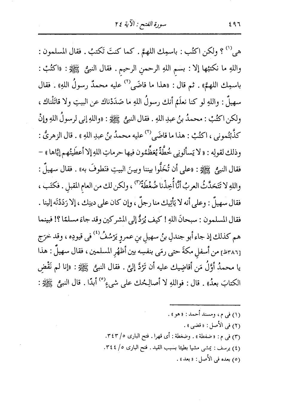 أفأخبرتك أنك تأتيه العام قلت : لا ، قال : فإنك آتيه ومطوف به ، فأتيت أبا بكر فقلت يا أبا بكر : أليس هذا نبي الله حقا قال : بلى ، قلت : ألسنا على الحق وعدونا على الباطل قال : بلى ، قلت : فلم نعطي الدنية في ديننا إذن قال : أيها الرجل إنه رسول الله وليس يعصي ربه وهو ناصره فاستمسك بغرزه تفز حتى تموت فو الله إنه لعلى الحق ، قلت : أوليس كان يحدثنا إنا سنأتي البيت ونطوف به قال : بلى أفأخبرك أنك تأتيه العام قلت : لا ، قال : فإنك آتيه ومطوف به ، قال عمر : فعملت لذلك أعمالا ، فلما فرغ من قضية الكتاب قال رسول الله صلى الله عليه وسلم لأصحابه : قوموا فانحروا ثم احلقوا ، فوالله ما قام رجل منهم حتى قال ذلك ثلاث مرات فلما لم يقم منهم أحد قام فدخل على أم سلمة فذكر لها ما لقي من الناس فقالت أم سلمة : يا نبي الله أتحب ذلك قال : نعم ، قالت : فاخرج ثم لا تكلم أحدا منهم حتى تنحر بدنك وتدعو حالقك فيحلقك.