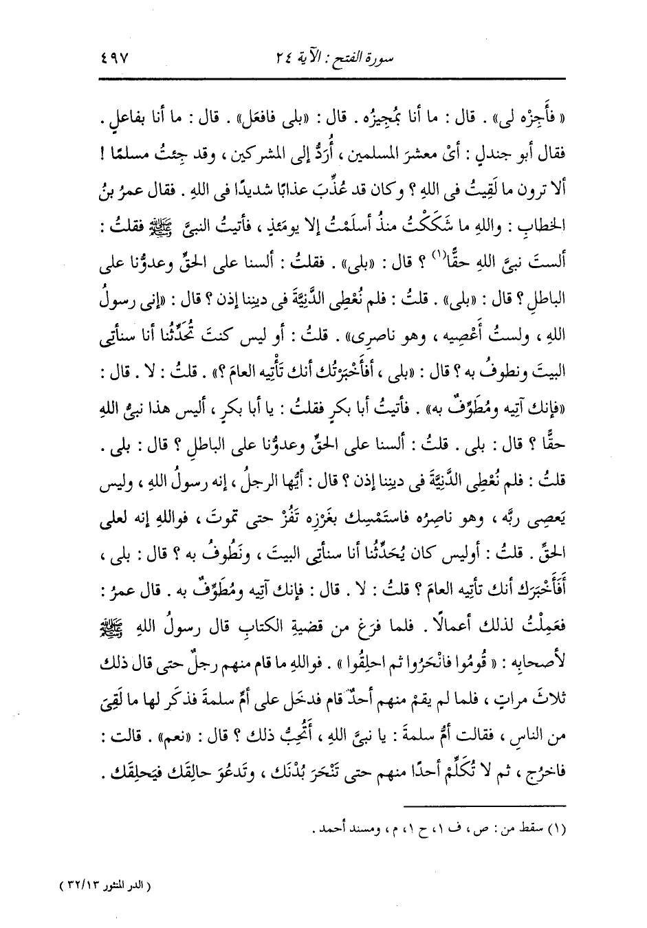فقام النَّبِيّ صلى الله عليه وسلم فخرج فلم يكلم أحدا منهم كلمة حتى فعل ذلك : نحر بدنه ودعا بحالقه فحلقه ، فلما رأوا ذلك قاموا فنحروا وجعل بعضهم يحلق بعضا حتى كاد بعضهم يقتل بعضا غما ، ثم جاءه نسوة مؤمنات فأنزل الله (يا أيها الذين آمنوا إذا جاءكم المؤمنات مهاجرات) (الممتحنة 10) حتى بلغ (بعصم الكوافر) فطلق عمر رضي الله عنه يومئذ امرأتين كانتا له في الشرك فتزوج إحداهما معاوية بن أبي سفيان والأخرى صفوان بن أمية ، ثم رجع النَّبِيّ صلى الله عليه وسلم إلى المدينة فجاءه أبو بصير رجل من قريش وهو مسلم فأرسلوا في طلبه رجلين فقالوا : العهد الذي جعلته لنا فدفعه النَّبِيّ صلى الله عليه وسلم إلى الرجلين فخرجا به حتى بلغا به ذا الحليفة فنزلوا يأكلون من تمر لهم فقال أبو بصير لأحد الرجلين : والله إني لأرى سيفك هذا يا فلان جيدا ، فاستله الآخر وقال : أجل والله إنه لجيد لقد جربت به وجربت ، فقال له أبو بصير : أرني أنظر إليه ، فأمكنه منه فضربه حتى برد وفر الآخر حتى أتى المدينة فدخل المسجد يعدو فقال رسول الله صلى الله عليه وسلم حين رآه : لقد رأى هذا ذعرا ، فلما انتهى إلى النَّبِيّ صلى الله عليه وسلم قال : قد قتل والله صاحبي وإني لمقتول فجاء أبو بصير