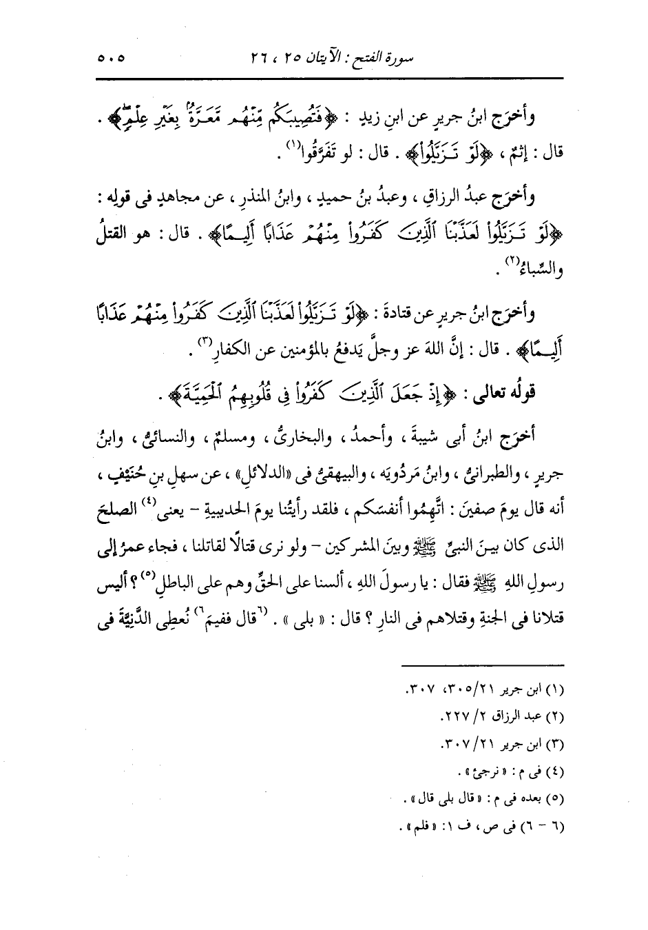 وأخرج النسائي والحاكم وصححه من طريق أبي إدريس عن أبي كعب رضي الله عنه أنه كان يقرأ [ إذ جعل الذين كفروا في قلوبهم الحمية حمية الجاهلية ولو حميتم كما حموا لفسد المسجد الحرم فأنزل الله سكينته على رسوله ] فبلغ ذلك عمر فاشتد عليه فبعث إليه فدخل عليه فدعا ناسا من أصحابه فيهم زيد بن ثابت فقال : من يقرأ منكم سورة الفتح فقرأ زيد على قراءتنا اليوم فغلظ له عمر فقال أبي أأتكلم قال : تكلم ، فقال : لقد علمت أني كنت أدخل على النَّبِيّ صلى الله عليه وسلم ويقرئني وأنت بالباب فإن