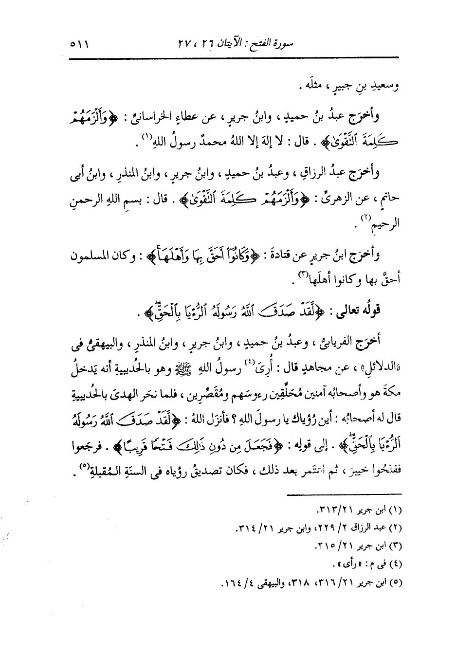 وأخرج عَبد بن حُمَيد ، وَابن جَرِير عن قتادة رضي الله عنه في قوله {لقد صدق الله رسوله الرؤيا بالحق} قال : رأى رسول الله صلى الله عليه وسلم أنه يطوف بالبيت وأصحابه فصدق الله رؤياه بالحق.