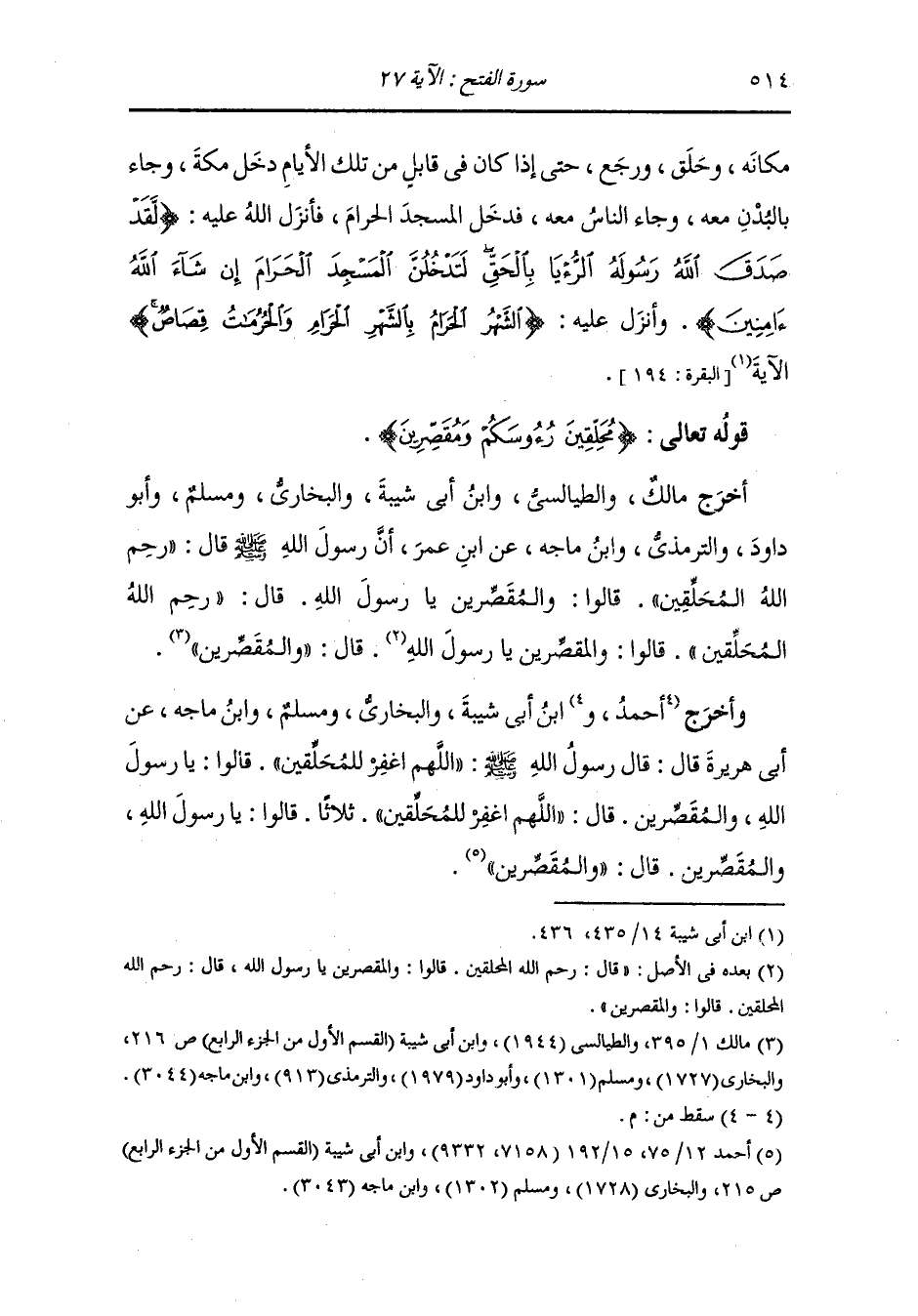 وأخرج الطيالسي وأحمد وأبو يعلى عن أبي سعيد أن رسول الله صلى الله عليه وسلم وأصحابه حلقوا رؤوسهم يوم الحديبية إلا عثمان بن عفان وأبا قتادة فاستغفر رسول الله صلى الله عليه وسلم للمحلقين ثلاثا وللمقصرين مرة.
