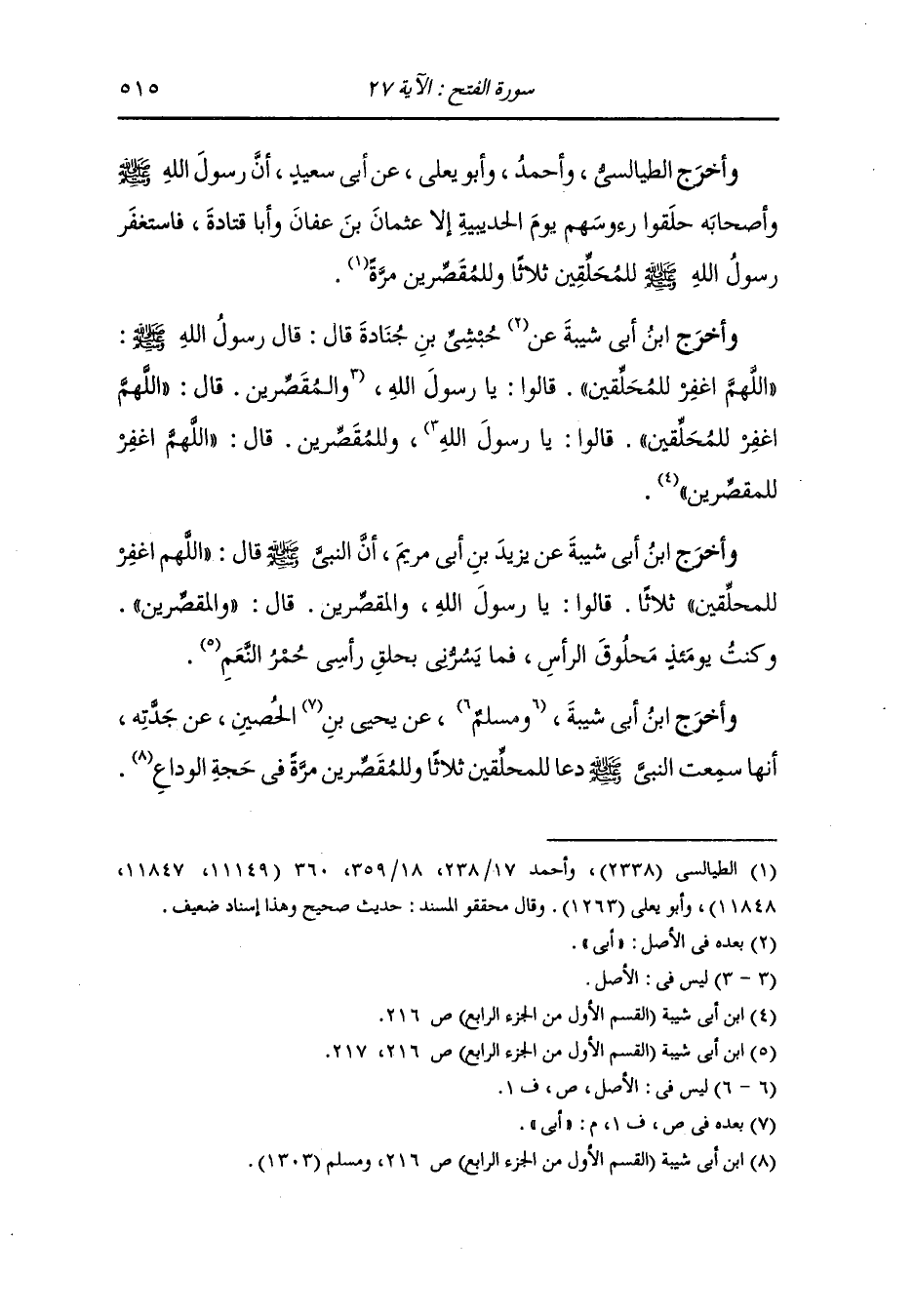 وأخرج ابن أبي شيبة عن ابن عباس قال : قال رسول الله صلى الله عليه وسلم : اللهم اغفر للمحلقين قالها ثلاثا فقالوا يا رسول الله ما بال المحلقين ظاهرت لهم الترحم قال : إنهم لم يشكوا.