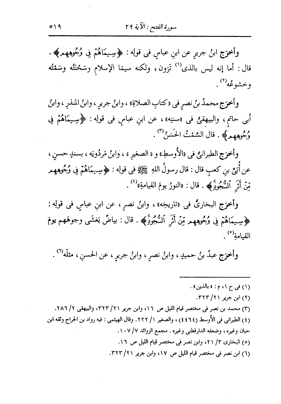 وأخرج الطبراني والبيهقي في "سُنَنِه" عن حميد بن عبد الرحمن قال : كنت عند السائب بن يزيد إذ جاء رجل في وجهه أثر السجود فقال : لقد أفسد هذا وجهه أما والله ما هي السيما التي سمى الله ولقد صليت على وجهي منذ ثمانين سنة ما أثر السجود بين عيني.