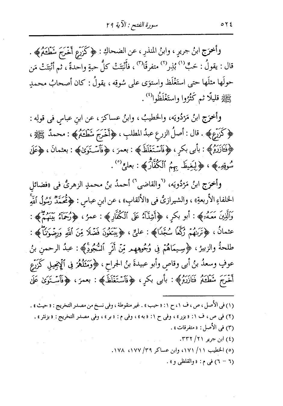 سوقه} بعثمان {يعجب الزراع ليغيظ بهم الكفار} بعلي {وعد الله الذين آمنوا وعملوا الصالحات} جميع أصحاب محمد صلى الله عليه وسلم.