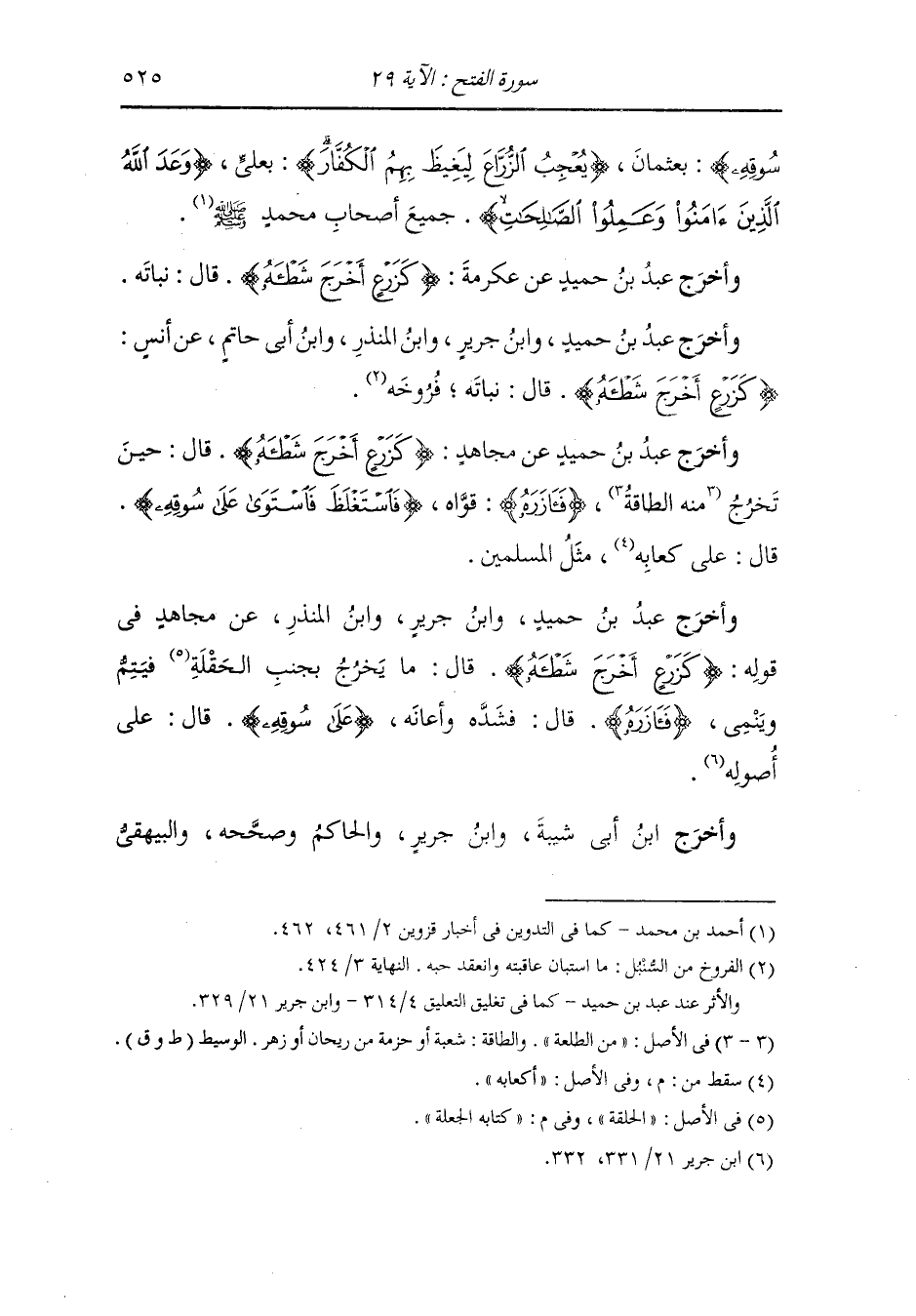 في سننه عن خيثمة قال : قرأ رجل على عبد الله سورة الفتح فلما بلغ {كزرع أخرج شطأه فآزره فاستغلظ فاستوى على سوقه يعجب الزراع ليغيظ بهم الكفار} قال : ليغيظ الله بالنبي صلى الله عليه وسلم بأصحابه الكفار ثم قال : أنتم الزرع وقد دنا حصاده.