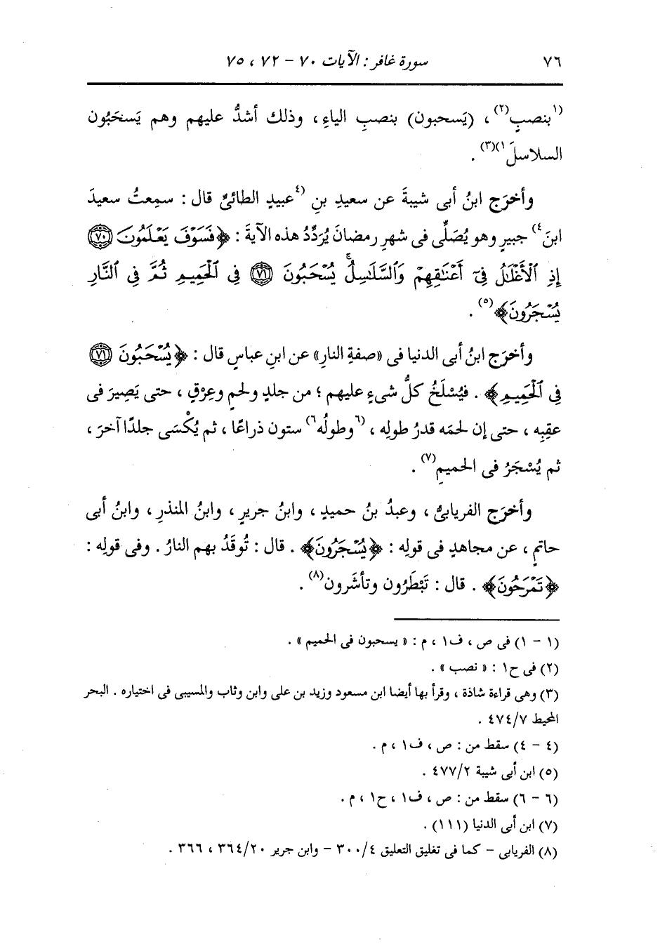 وأخرج ابن أبي الدنيا في صفة النار عن ابن عباس رضي الله عنهما قال {يسحبون في الحميم} فيسلخ كل شيء عليهم من جلد ولحم وعرق حتى يصير في عقبه ، حتى أن لحمه قدر طوله ستون ذراعا ، ثم يكسى جلدا آخر ثم يسجر في الحميم فيسلخ كل شيء عليهم من جلد ولحم وعرق.