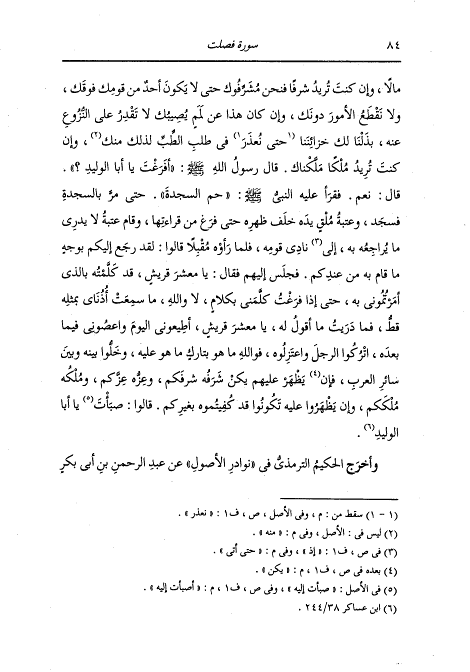 مالا وأن كنت تريد شرفا فنحن مشرفوك حتى لا يكون أحد من قومك فوقك ولا نقطع الأمور دونك وإن كان هذا عن لمم يصيبك لا تقدر على النزوع عنه بذلنا لك خزائنا في طلب الطب لذلك منه وإن كنت تريد ملكا ملكناك ، قال رسول الله صلى الله عليه وسلم : أفرغت يا أبا الوليد قال : نعم ، فقرأ رسول الله صلى الله عليه وسلم {حم} السجدة حتى مر بالسجدة فسجد وعتبة ملق يده خلف ظهره حتى فرغ من قراءته وقام عتبة لا يدري ما يراجعه به ، حتى أتى نادي قومه فلما رأوه مقبلا قالوا : لقد رجع إليكم بوجه ما قام به من عندكم فجلس إليهم فقال : يا معشر قريش قد كلمته بالذي أمرتموني به ، حتى إذا فرغت كلمني بكلام لا والله ما سمعت أذناي بمثله قط فما دريت ما أقول له يا معشر قريش أطيعوني اليوم واعصوني فيما بعده ، اتركوا الرجل واعتزلوه فوالله ما هو بتارك ما هو عليه وخلوا بينه وبين سائر العرب فإن يكن يظهر عليهم يكن شرفه شرفكم وعزه عزكم وملكه ملككم وإن يظهروا عليه تكونوا قد كفيتموه بغيركم ، قالوا : أصبأت إليه يا أبا الوليد.