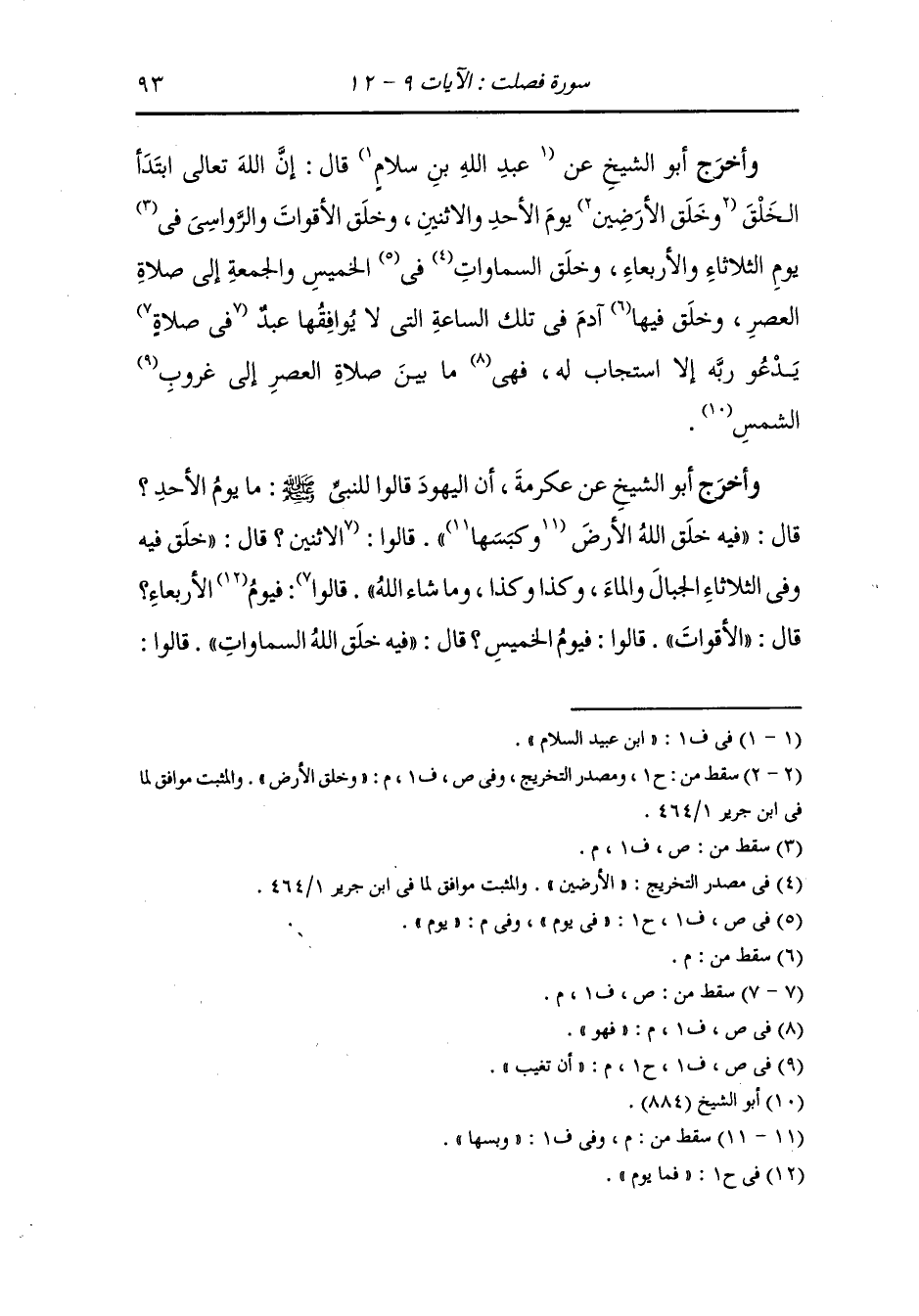 وأخرج أبو الشيخ عن عبد الله بن سلام رضي الله عنه قال : إن الله تعالى ابتدأ الخلق وخلق الأرض يوم الأحد والإثنين وخلق الأقوات والرواسي يوم الثلاثاء والأربعاء وخلق السموات يوم الخميس والجمعة إلى صلاة العصر وخلق آدم