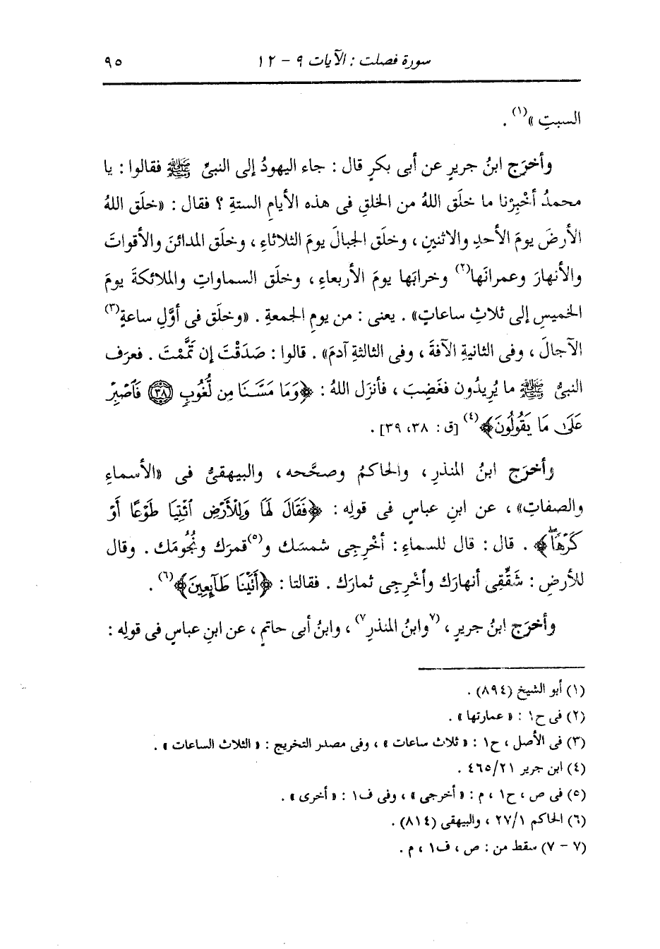 وأخرج ابن جرير عن أبي بكر رضي الله عنه قال : جاء اليهود إلى النَّبِيّ صلى الله عليه وسلم فقالوا : يا محمد أخبرنا ما خلق الله من الخلق في هذه الأيام الستة فقال : خلق الله الأرض يوم الأحد والإثنين وخلق الجبال يوم الثلاثاء وخلق المدائن والأقوات والأنهار وعمرانها وخرابها يوم الأربعاء وخلق السموات والملائكة يوم الخميس إلى ثلاث ساعات يعني من يوم الجمعة وخلق في أول ساعة الآجال وفي الثانية الآفة وفي الثالثة آدم قالوا : صدقت إن تممت فعرف النَّبِيّ صلى الله عليه وسلم ما يريدون فغضب فأنزل الله (وما مسنا من لغوب فاصبر على ما يقولون) .