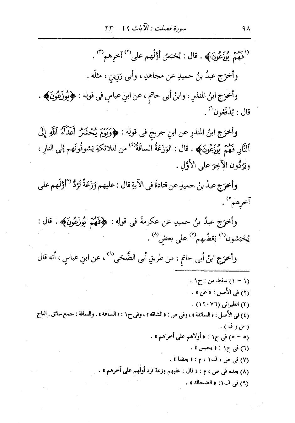 وأخرج عَبد بن حُمَيد عن عكرمة رضي الله عنه في قوله {فهم يوزعون} قال : يحبسون بعضا على بعض قال : عليهم وزعة ترد أولهم على آخرهم.