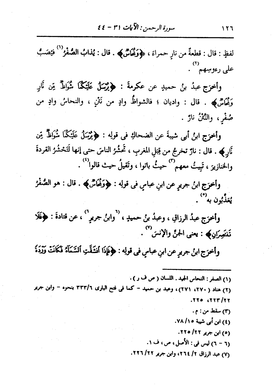وأخرج ابن جرير عن ابن عباس رضي الله عنهما في قوله {ونحاس} قال : هو الصفر يعذبون به.