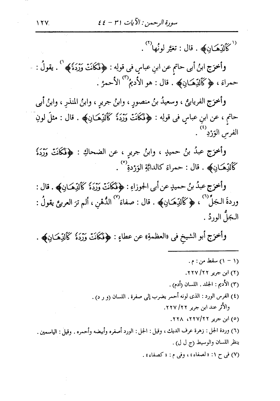 كالدهان) .قال تغير لونها.}وأخرج ابن أبي حاتم عن ابن عباس في قوله : (فكانت وردة). يقول : حمراء {كالدهان} قال : هو الأديم الأحمر.