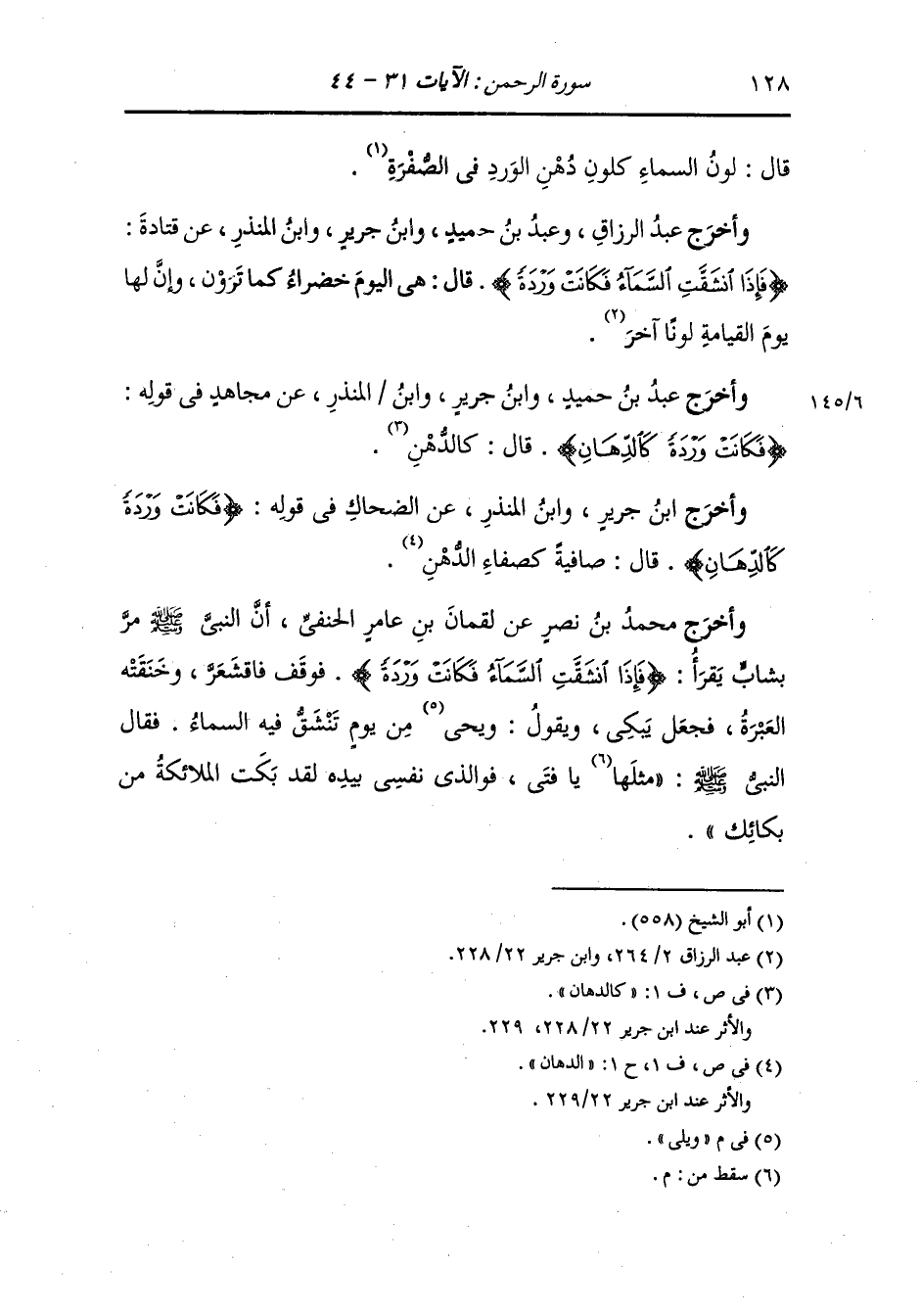 وأخرج عبد الرزاق ، وعَبد بن حُمَيد ، وَابن جَرِير ، وَابن المنذر عن قتادة {فإذا انشقت السماء فكانت وردة كالدهان} قال : هي اليوم خضراء كما ترون وإن لها يوم القيامة لونا آخر.