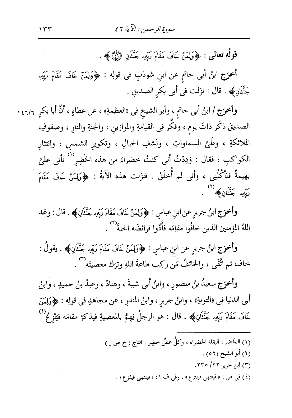 وأخرج ابن أبي حاتم وأبو الشيخ في العظمة عن عطاء أن أبا بكر الصديق رضي الله عنه ذكر ذات يوم وفكر في القيامة والموازين والجنة والنار وصفوف الملائكة وطي السموات ونسف الجبال وتكوير الشمس وانتثار الكواكب فقال : وددت أني كنت خضراء من هذا الخضر تأتي علي بهيمة فتأكلني وأني لم أخلق فنزلت هذه الآية {ولمن خاف مقام ربه جنتان}.