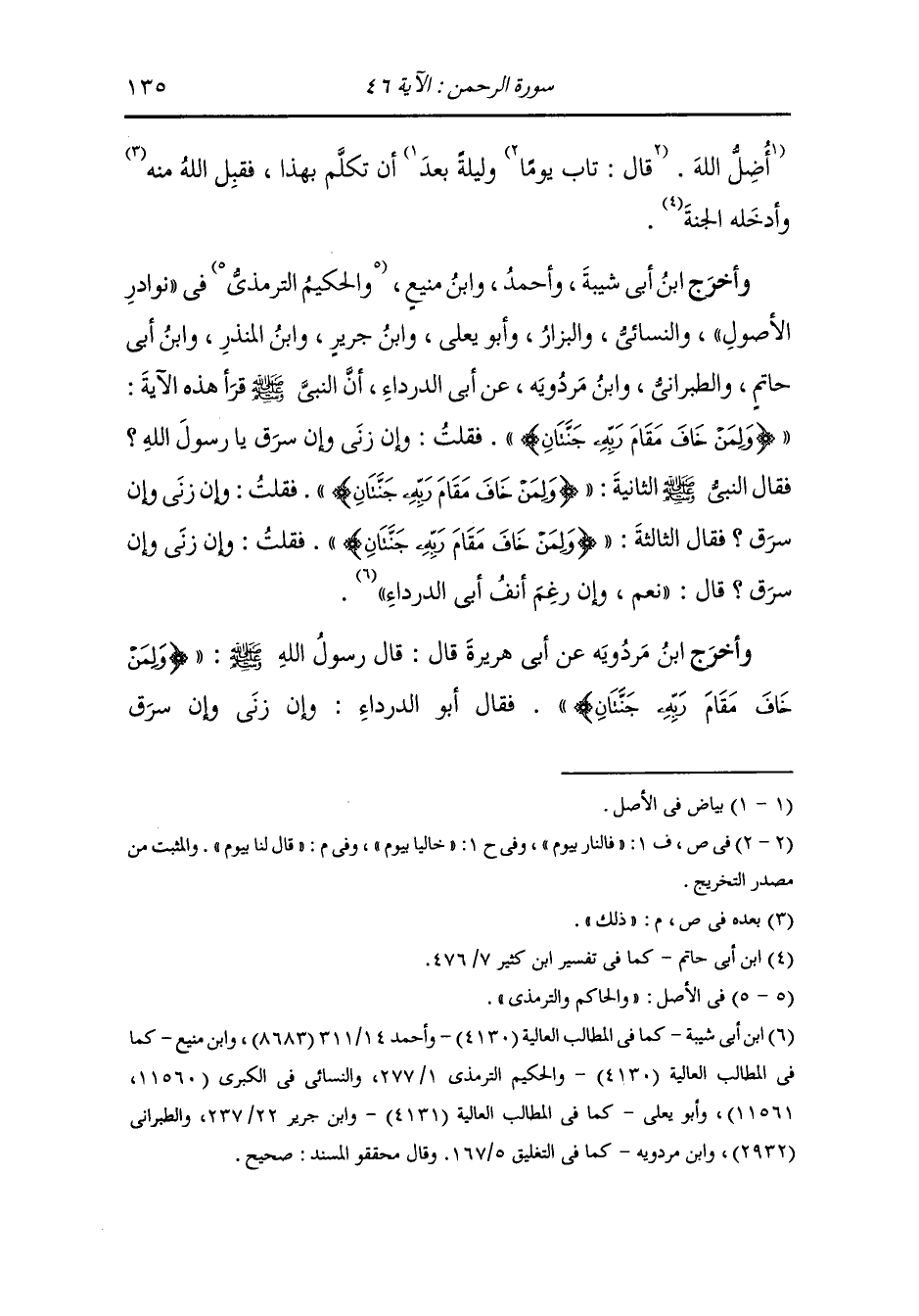 وأخرج ابن أبي شيبة وأحمد ، وَابن منيع والحكيم في نوادر الأصول والنسائي والبزار وأبو يعلى ، وَابن جَرِير ، وَابن أبي حاتم ، وَابن المنذر والطبراني ، وَابن مردويه عن أبي الدرداء أن النَّبِيّ صلى الله عليه وسلم قرأ هذه الآية {ولمن خاف مقام ربه جنتان} فقلت : وإن زنى وإن سرق يا رسول الله فقال النَّبِيّ صلى الله عليه وسلم الثانية {ولمن خاف مقام ربه جنتان} فقلت : وإن زنى وإن سرق فقال الثالثة {ولمن خاف مقام ربه جنتان} فقلت : وإن زنى وإن سرق قال : نعم وإن رغم أنف أبي الدرداء.