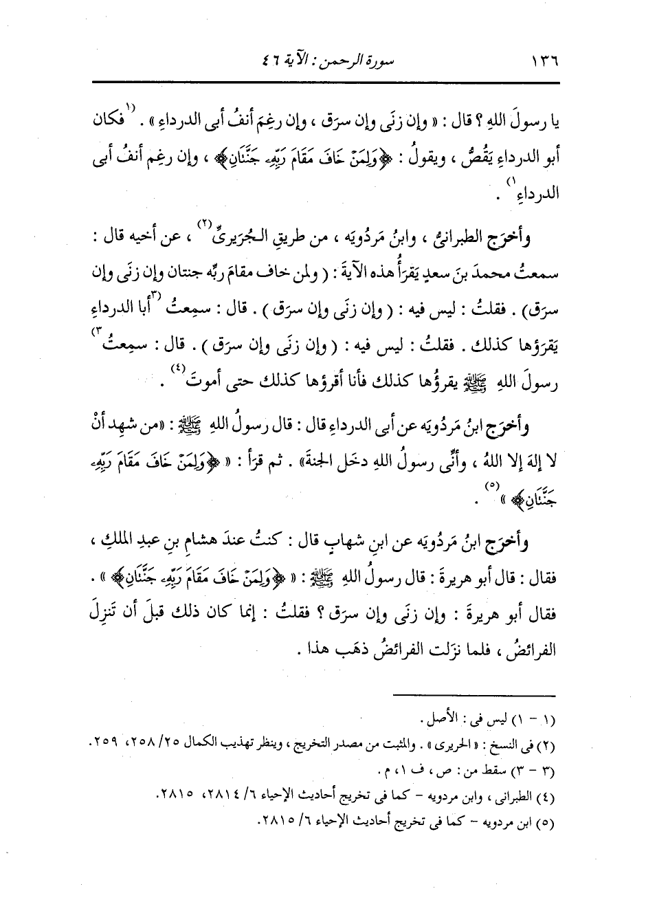 وأخرج ابن مردويه عن ابن شهاب قال : كنت عند هشام بن عبد الملك فقال : قال أبو هريرة رضي الله عنه : قال رسول الله صلى الله عليه وسلم : {ولمن خاف مقام ربه جنتان} فقال أبو هريرة رضي الله عنه : وإن زنى وإن سرق فقلت : إنما كان ذلك قبل أن تنزل الفرائض فلما نزلت الفرائض ذهب هذا.