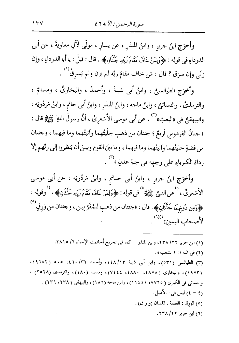 وأخرج ابن جرير ، وَابن أبي حاتم ، وَابن مردويه عن أبي موسى عن النَّبِيّ صلى الله عليه وسلم في قوله : {ولمن خاف مقام ربه جنتان} وقوله {ومن دونهما جنتان} قال : جنتان من ذهب للمقربين وجنتان من ورق لأصحاب اليمين.