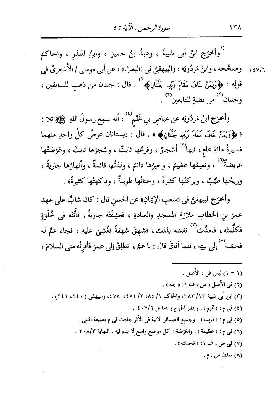 وأخرج ابن أبي شيبة ، وعَبد بن حُمَيد ، وَابن المنذر والحاكم وصححه ، وَابن مردويه والبيهقي في البعث عن أبي موسى الأشعري رضي الله عنه في قوله {ولمن خاف مقام ربه جنتان} قال : جنتان من ذهب للسابقين وجنتان من فضة للتابعين.