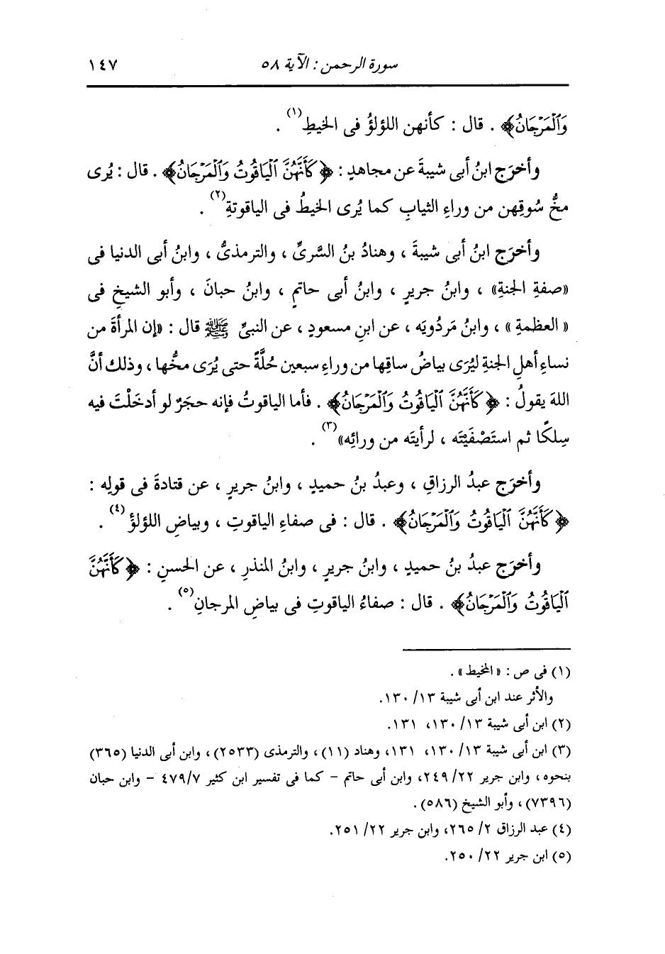 وَأخرَج عَبد بن حُمَيد ، وَابن جَرِير ، وَابن المنذر عن الحسن : (كأنهن الياقوت والمرجان) قال: صفاء الياقوت في بياض المرجان.