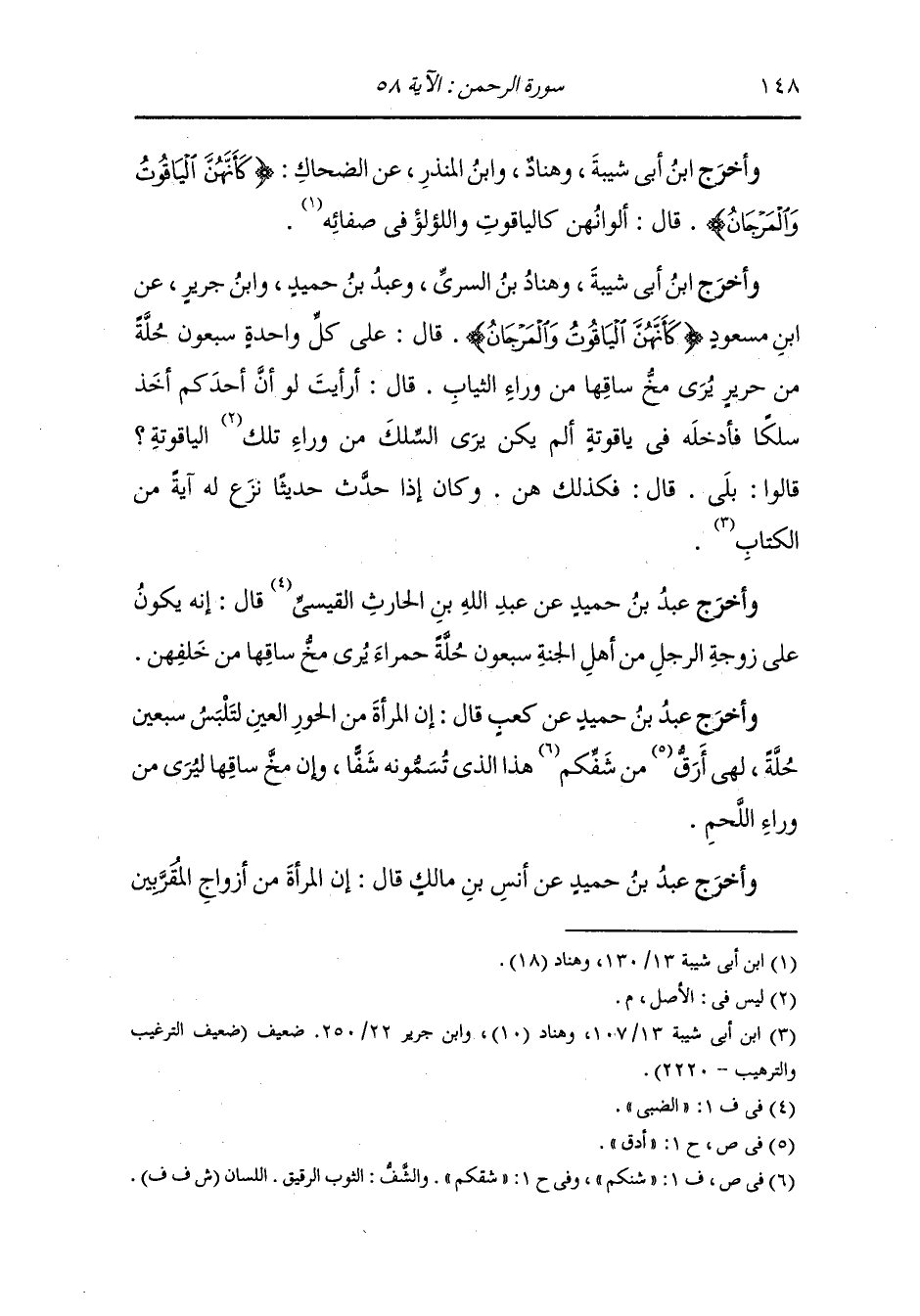 وأخرج عَبد بن حُمَيد عن كعب قال : إن المرأة من الحور العين لتلبس سبعين حلة لهي أرق من شفكم هذا الذي تسمونه شفا وإن مخ ساقها ليرى من وراء اللحم.