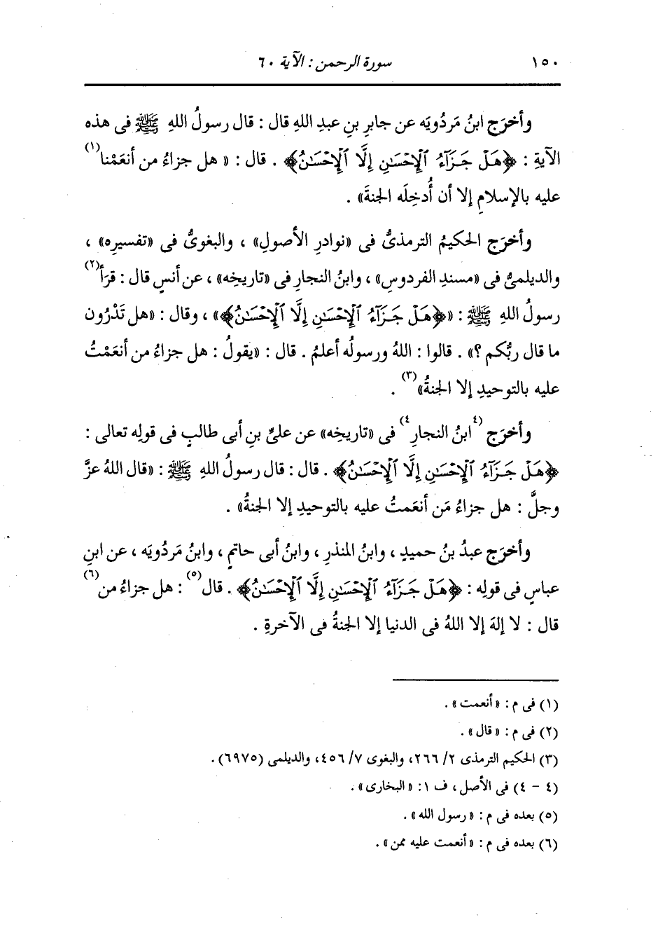 وأخرج الحكيم الترمذي في نوادر الأصول والبغوي في تفسيره والديلمي في مسند الفروس ، وَابن النجار في تاريخه عن أنس قال : قال رسول الله صلى الله عليه وسلم : {هل جزاء الإحسان إلا الإحسان} وقال : هل تدرون ما قال ربكم قالوا : الله ورسوله أعلم قال : يقول : هل جزاء من أنعمت عليه بالتوحيد إلا الجنة.